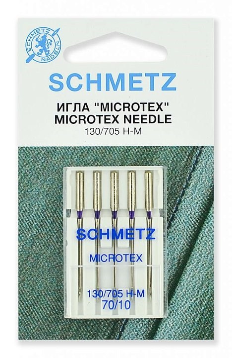 Иглы микротекс (особо острые) Schmetz №70(10). Используются для особо прямолинейных стежков при отстрачивании кантов, а также для шёлка, тканей из микроволокон, текстильных материалов с покрытиями, плёнок и искусственной кожи.